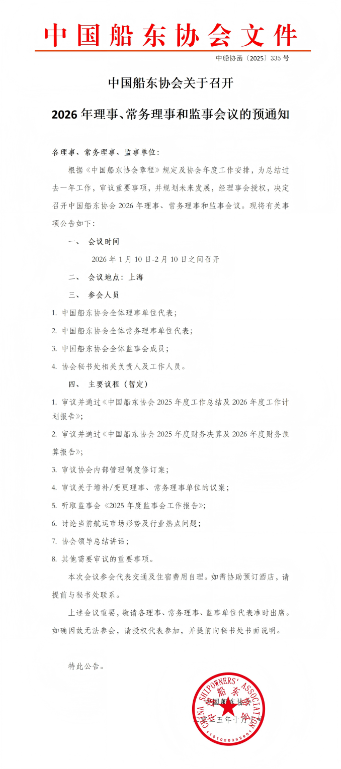 中国船东协会关于召开 2026年理事、常务理事和监事会议的预通知