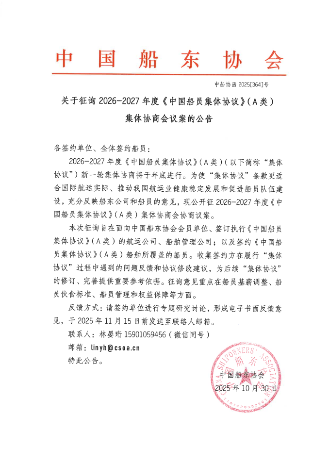 关于征询2026-2027年度《中国船员集体协议》(A类)集体协商会议案的公告