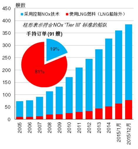柱形图表示的是符合'Tier III'标准的船队发展情况。其中包括:采用SCR、EGR、及LNG燃料的船舶。如上图所示,符合标准的船舶已从2005年初的74艘增长至截止目前的385艘。虽然船队数量有了显著的增长,但符合标准的船舶仍然只占全球船队中的很小比例(0.4%)。