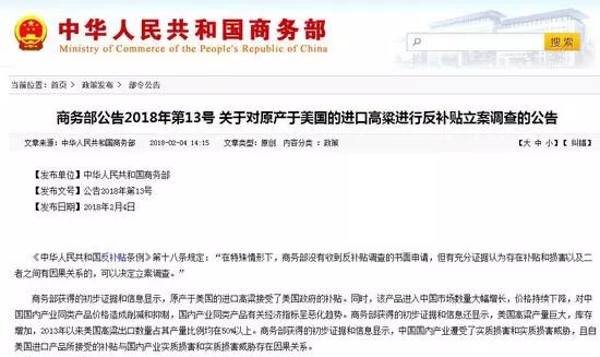 2月4日,中国商务部发布2018年第12号和第13号公告,对美国高粱发起反倾销和反补贴立案调查。