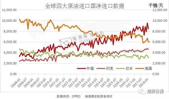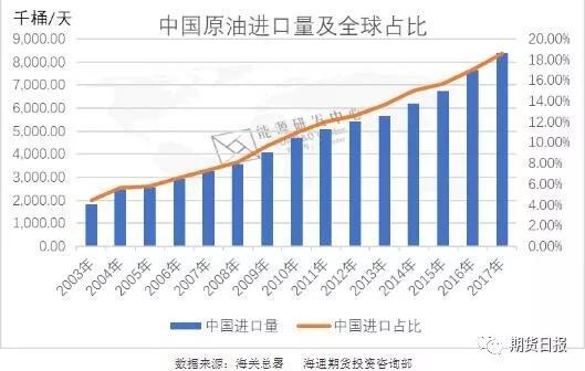 相对于消费量的增长,中国原油进口量的表现更是吸引了全球目光,数据显示截至2017年中国原油进口量已经高达840万桶/天,位居全球第一,占全球原油进口量接近19%,而从2018年的数据来看,原油进口数据继续高速增长,已经突破900万桶/天,不出意外2018年中国原油进口量占比将到达全球的1/5,这将是非常惊人的数字,作为进口端的寡头,中国通过上市原油期货建立亚太基准价,拒绝沙特等不合理定价、国际市场扩张供应端资源等系列的动作增强在原油市场的相关地位是水到渠成的事情。