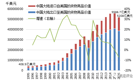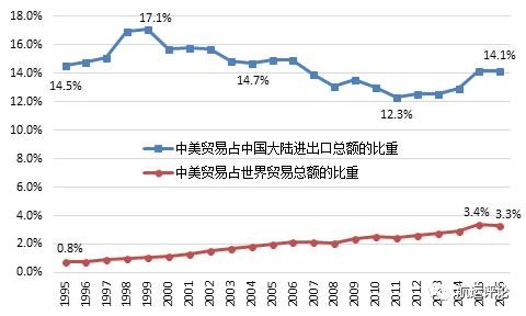从中美贸易历史发展的总体情况来看,中美贸易额在经历了2000-2011年的高速增长后,增速已逐年下滑,并于2016年从5586.7亿美元的高位下滑至5208亿美元。但尽管如此,中美贸易仍然在世界贸易中占有重要的市场份额。从中美贸易占中国大陆进出口总额的比重来看,基本维持在14.4%左右,曾于1999年达到最高点17.1%,之后随着中国对外贸易局面的逐步打开,该比重虽有所下滑,但美国作为中国第二大贸易伙伴的地位仍然稳固。从中美贸易占世界贸易总额的比重来看,中美贸易的市场份额由1995年的0.8%稳步上升至2016年的3.3%,在世界贸易中的重要度不断提升。