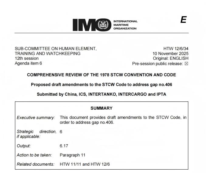近日,中国政府与国际航运公会(ICS)、国际独立油轮船东协会(INTERTANKO)、国际干散货船东协会(INTERCARGO)及国际包裹油轮协会(IPTA)联合向国际海事组织(IMO)提交的提案“针对第406号差距对《1978年STCW公约与规则》的修正建议”(HTW 12/6/34),已在IMO官方网站正式登出。该联合提案由中国船东协会联络促成,旨在填补《压载水公约》相关船员能力最低标准的行业空白,推动全球海事培训标准完善与海洋生态保护。
