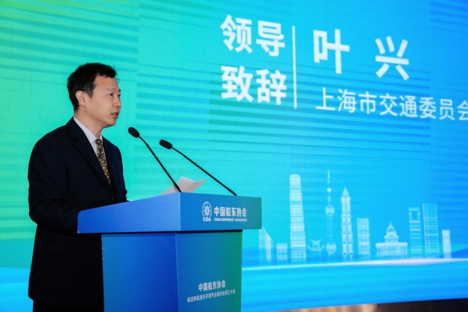 中国船东协会会长万敏,交通运输部海事局副局长施滨峰,上海市交通委员会副主任叶兴为会议致辞。