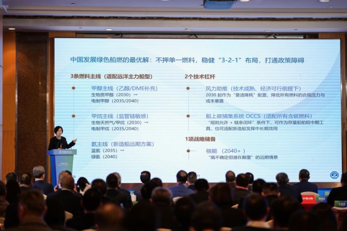 在专家主旨演讲环节,黄震院士全景呈现我国船舶新能源发展脉络,为技术突破指明路径;大连海事大学张爽研究员解读国际航运脱碳政策,提出我国应采取“3-2-1”多元燃料布局策略,为绿色船用燃料发展提供实践指导;中国船级社武汉规范所副所长魏颖春勾勒可持续航运燃料产业生态蓝图。