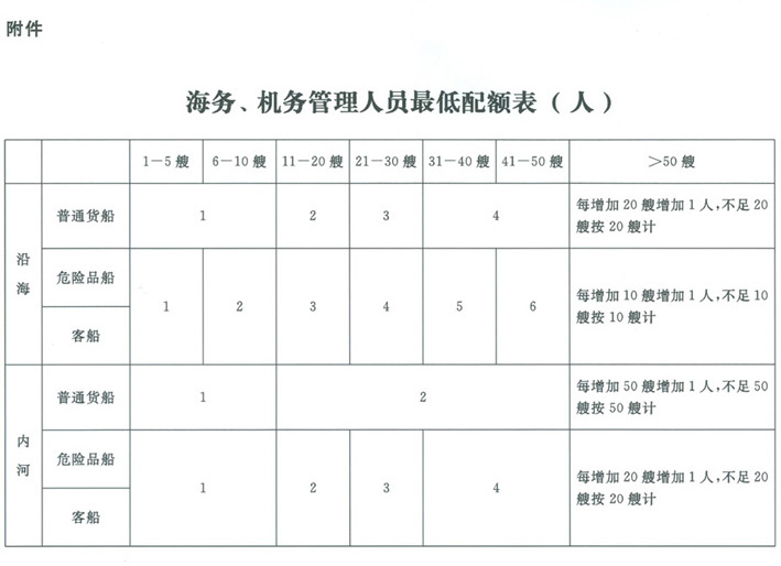 (一)船舶管理业务经营者应当至少配备海务、机务管理人员各1人,配备的具体数量应当符合附件规定的要求;