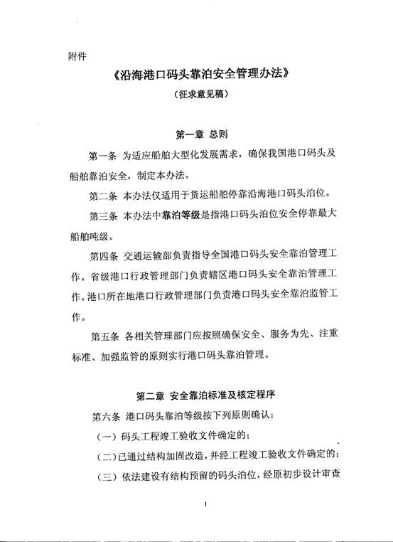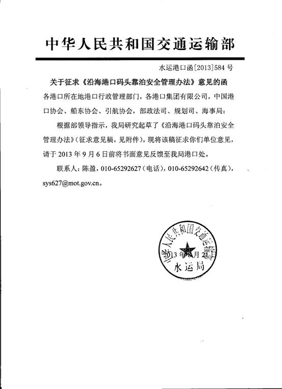 关于征求《沿海港口码头靠泊安全管理办法》意见的函