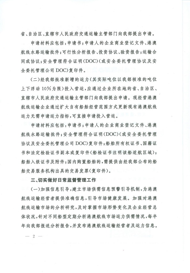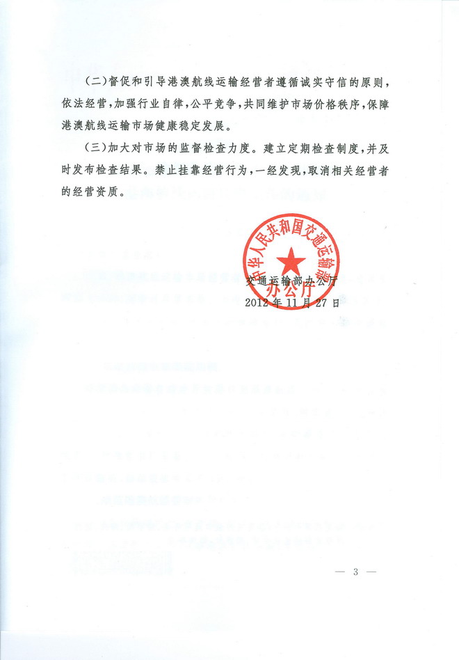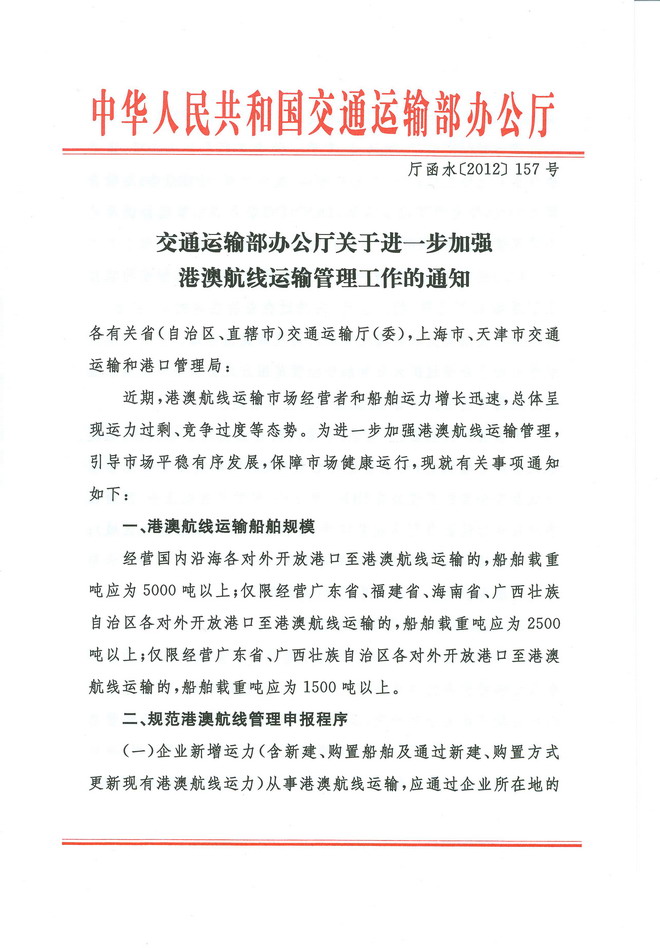 交通运输部办公厅关于进一步加强港澳航线运输管理工作的通知